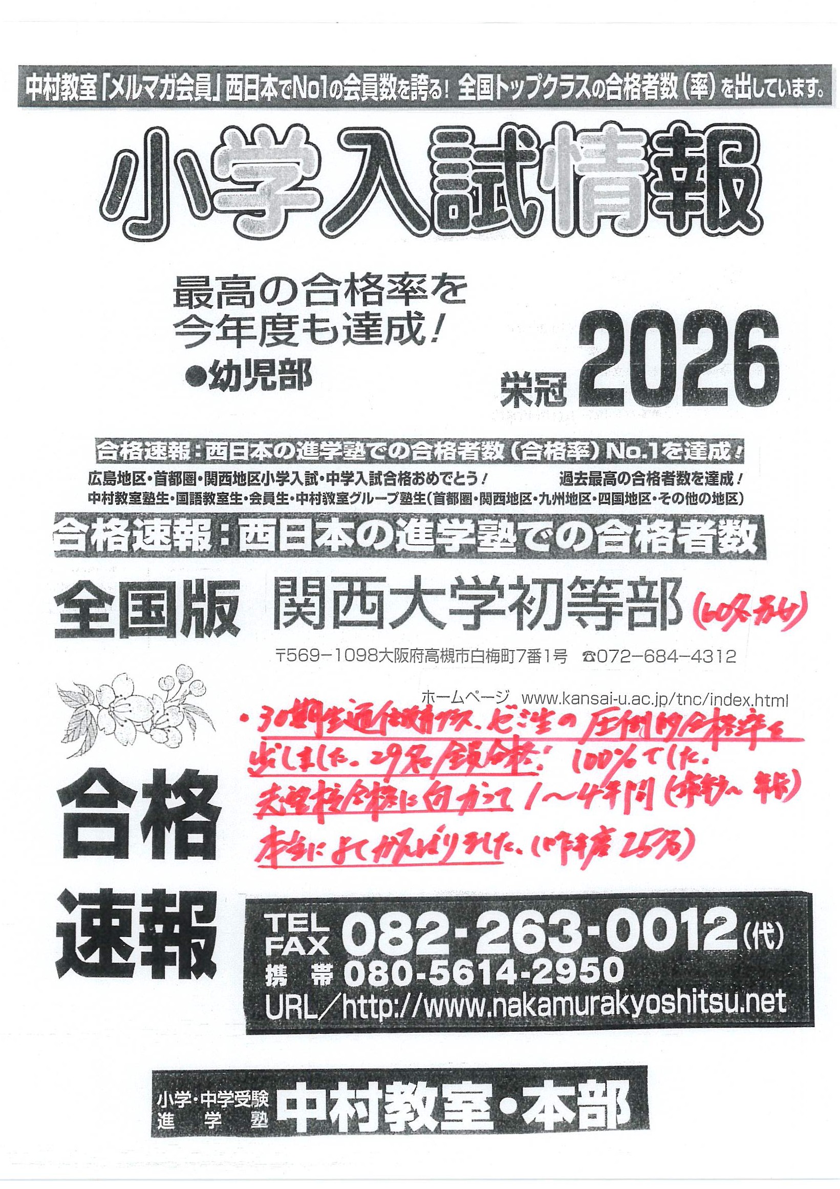 2025年09月20日 ㊗【合格速報】2026年 関西大学初等部 合格おめでとう!