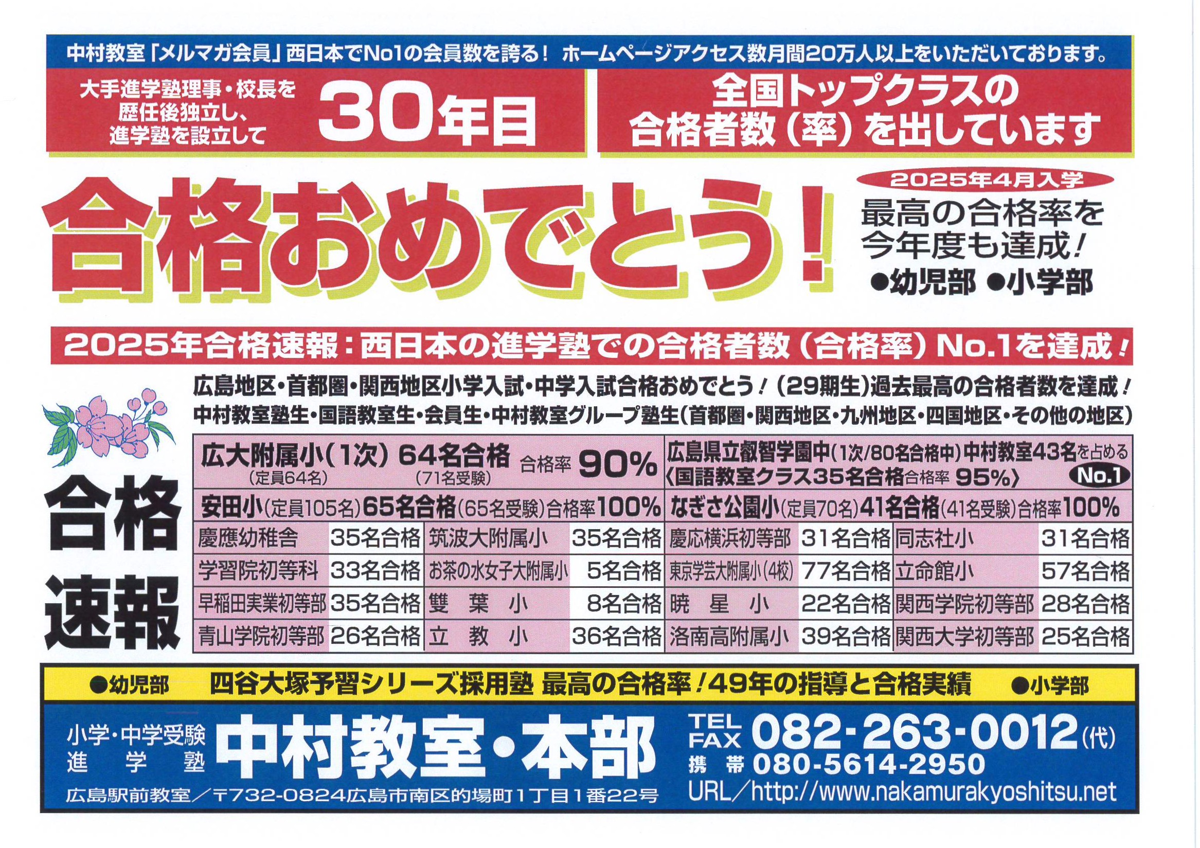 中村教室は全国対応、最高の合格率を今年度も達成。小学・中学受験合格力No1!