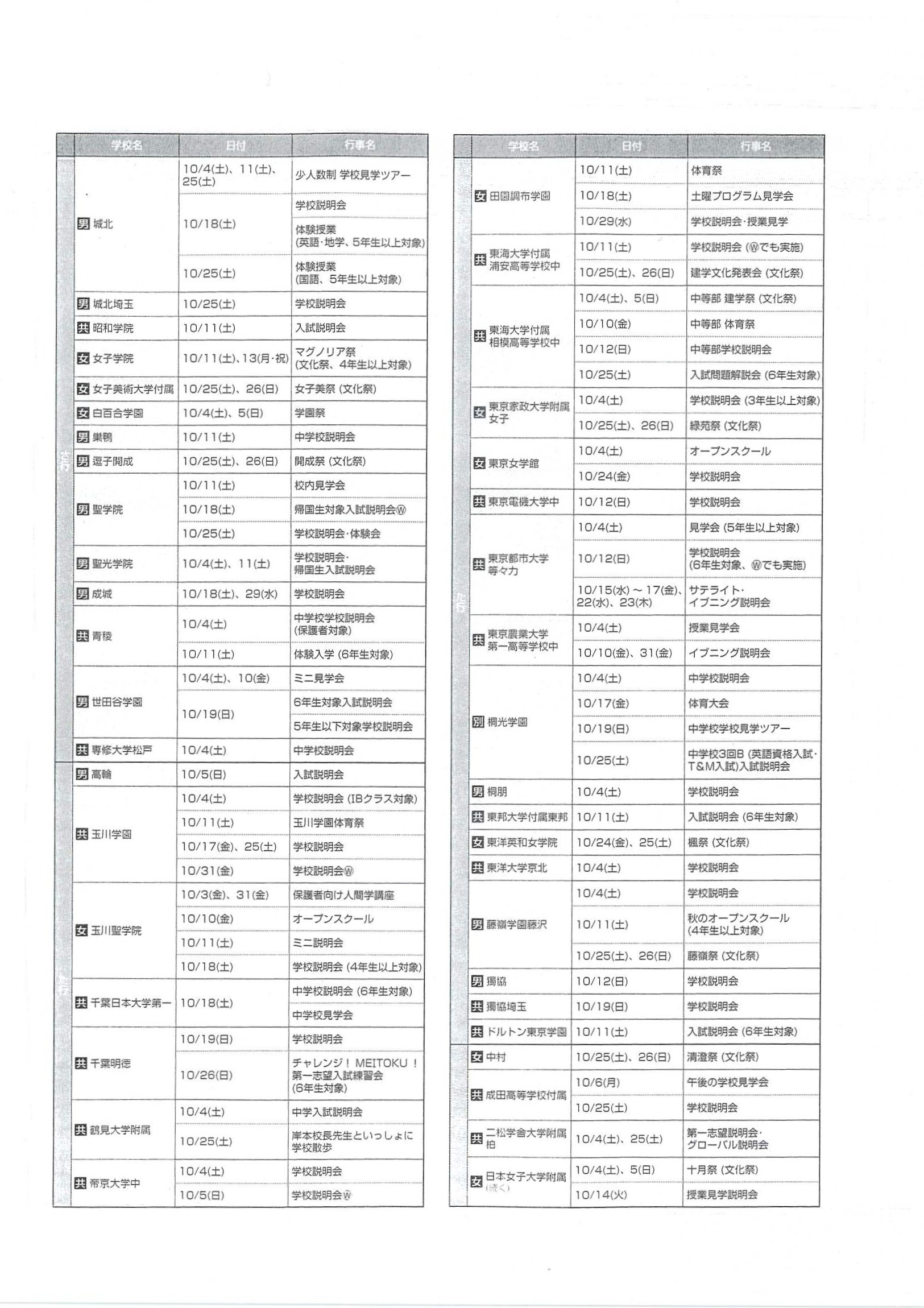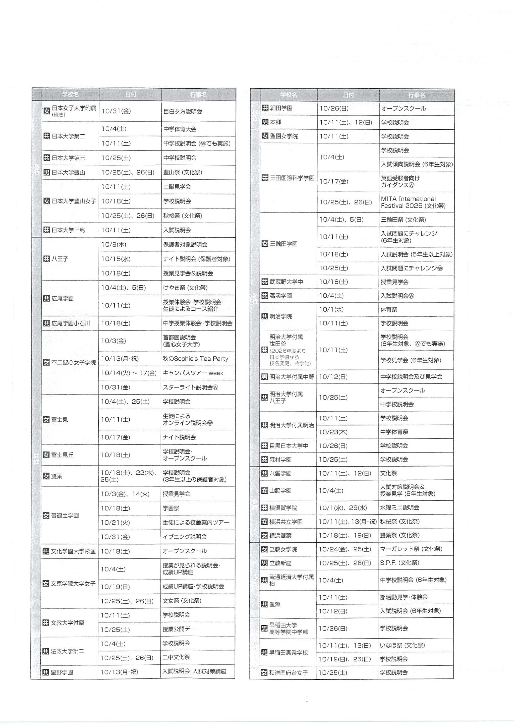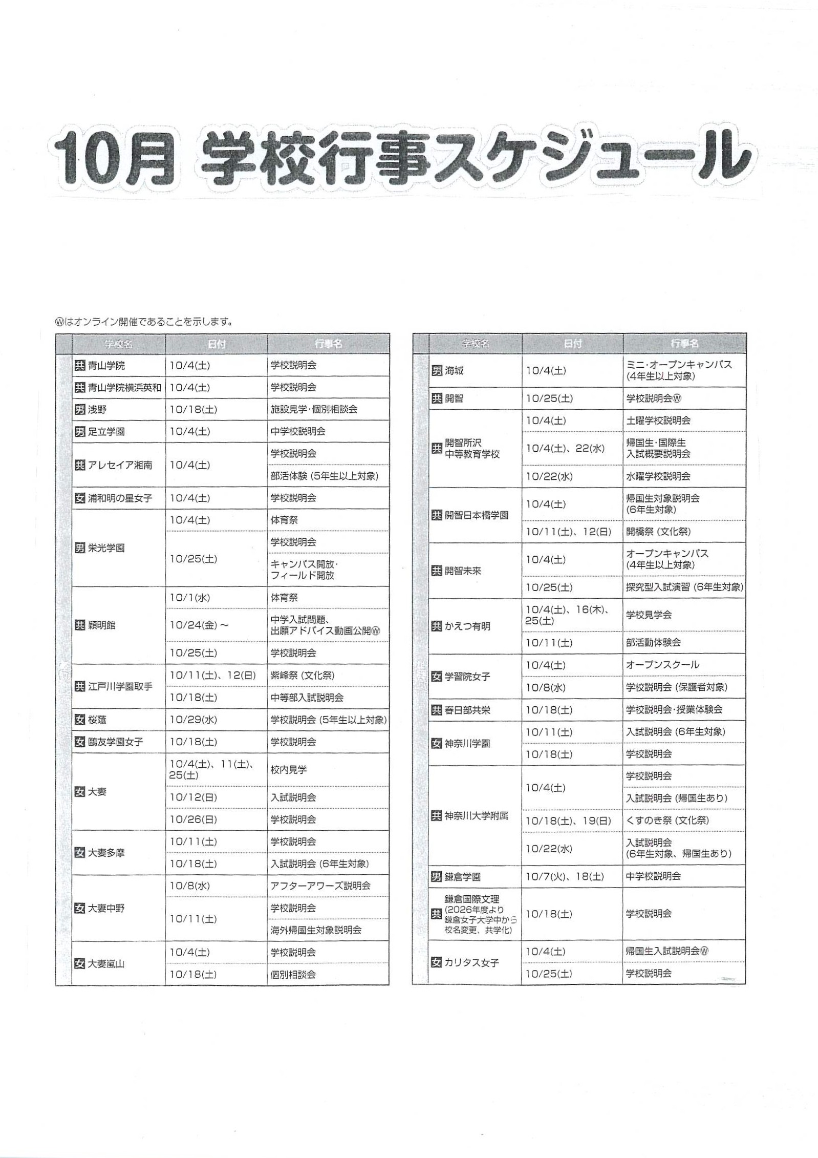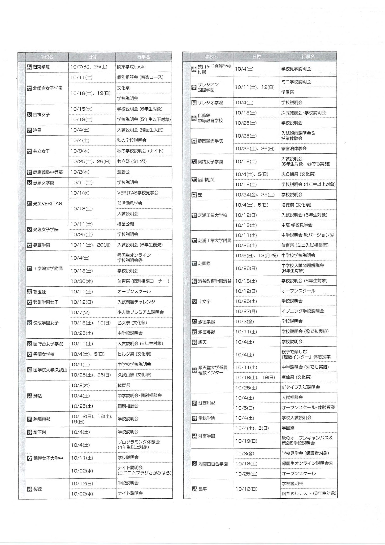 2025年09月23日 2026年 【首都圏中学入試】学校行事スケジュール(10月)