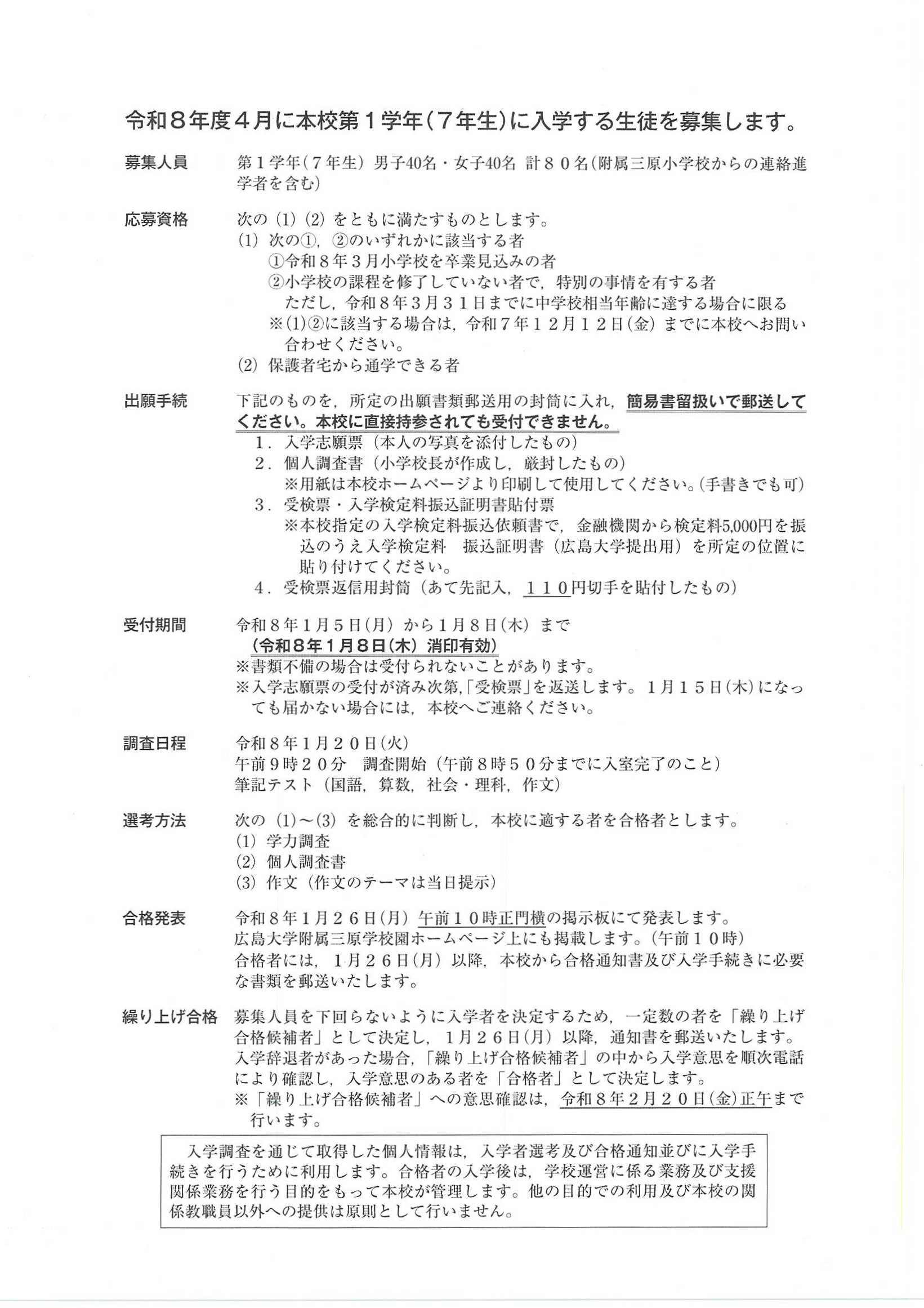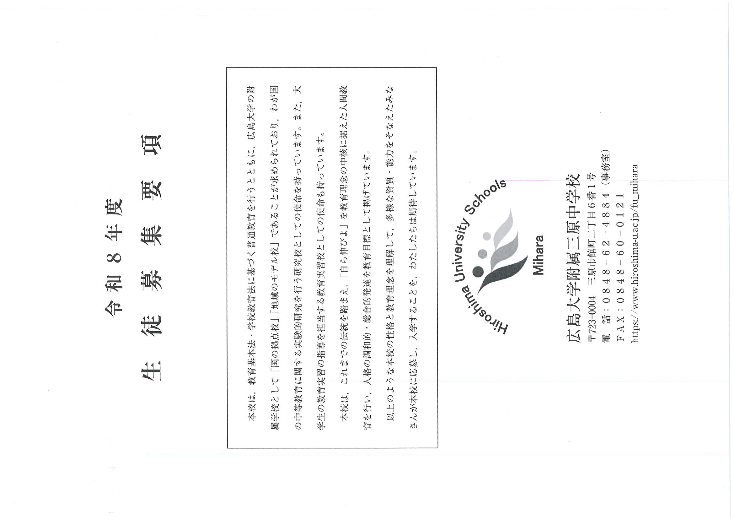 2025年11月02日 2026年 【広大附属三原中学校】生徒募集要項