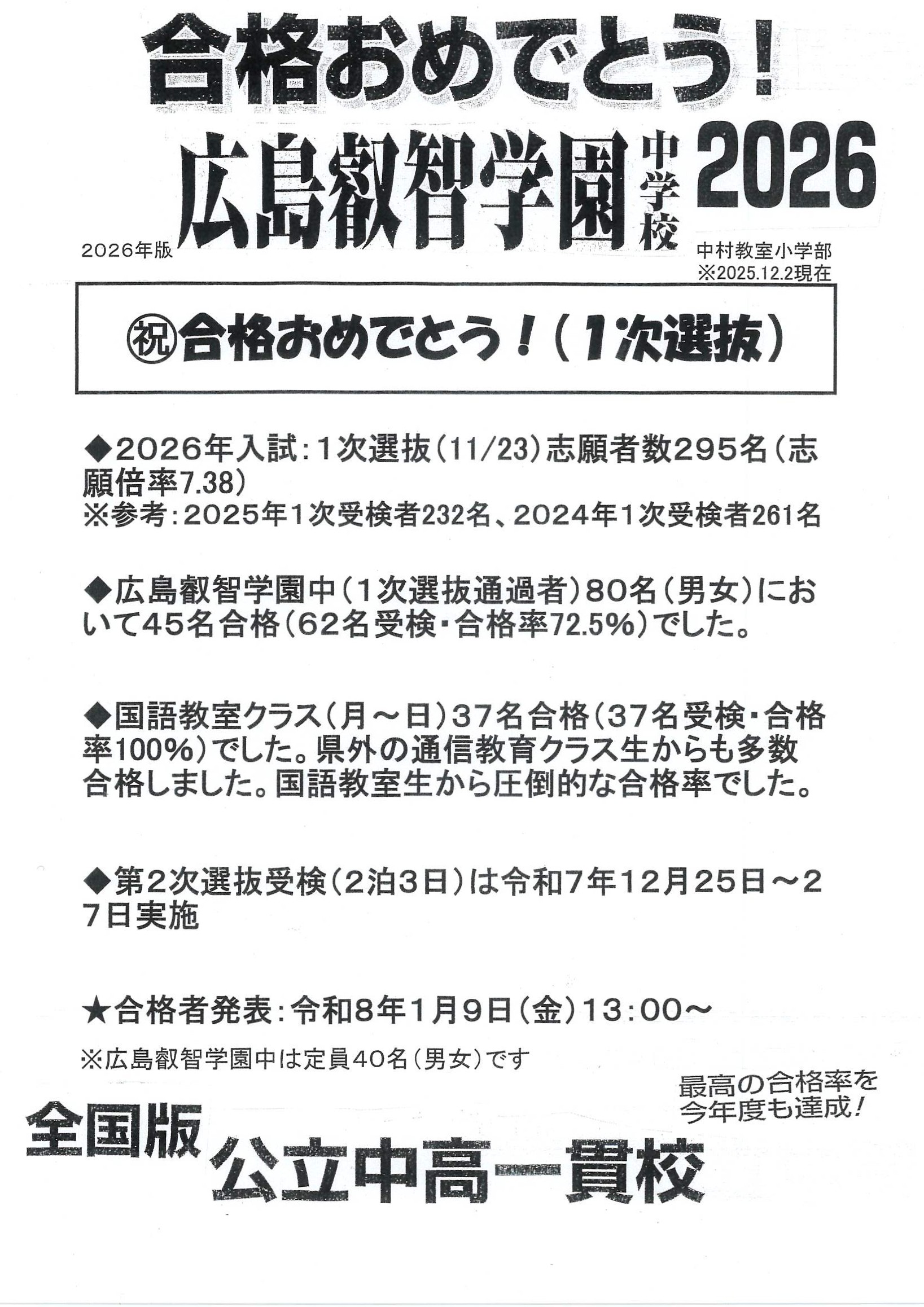 2025年12月03日 ㊗2026年広島叡智学園中(1次)✿45名合格!おめでとう❀