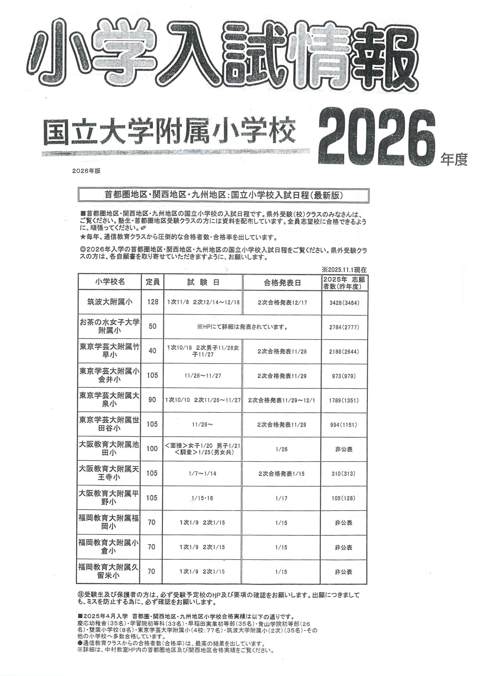 2025年11月01日 ★2026年 【首都圏・関西・九州地区】国立小入試日程最新版