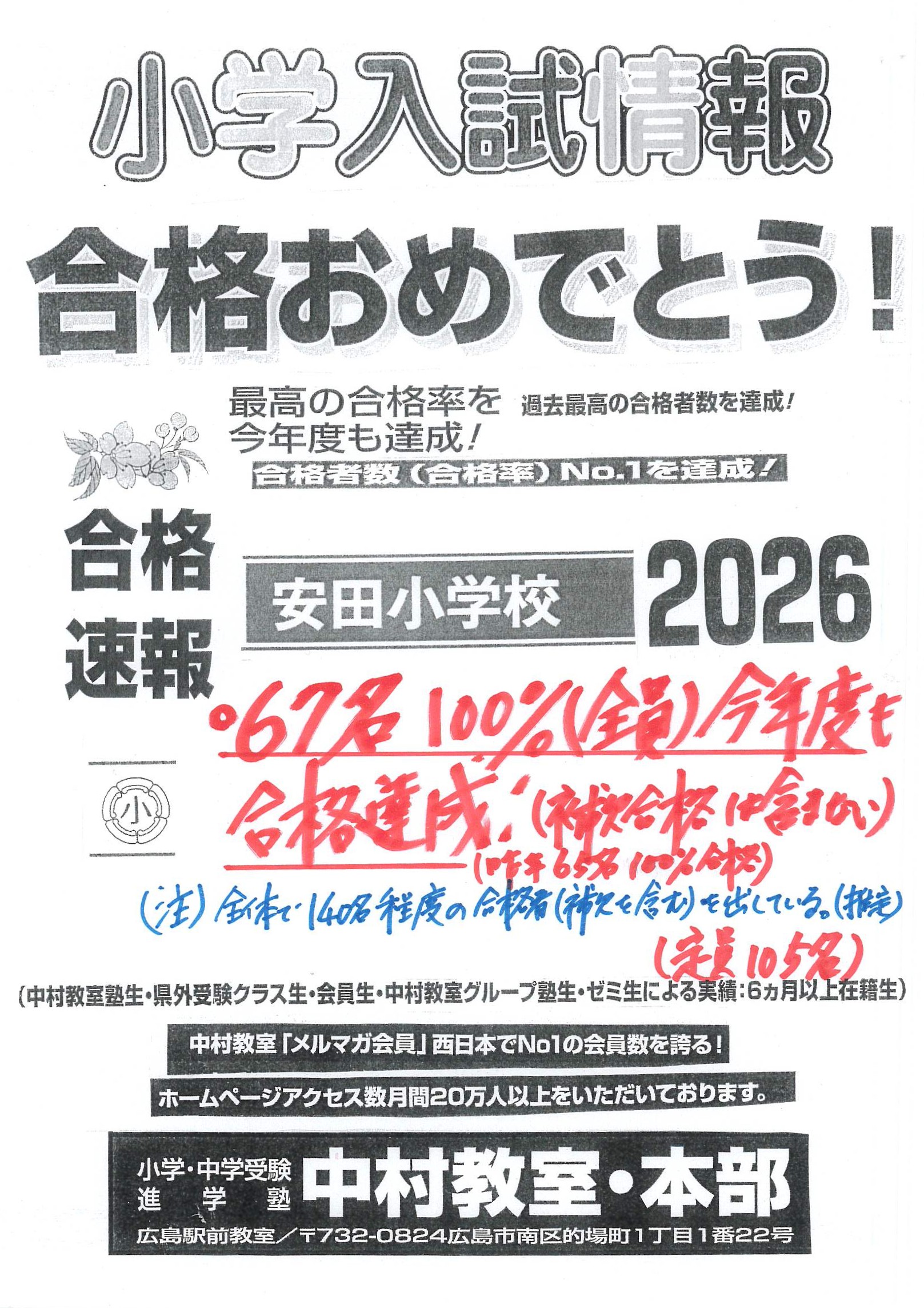 2025年11月12日 2026年 安田小学校 ㊗100%全員合格達成!(速報)