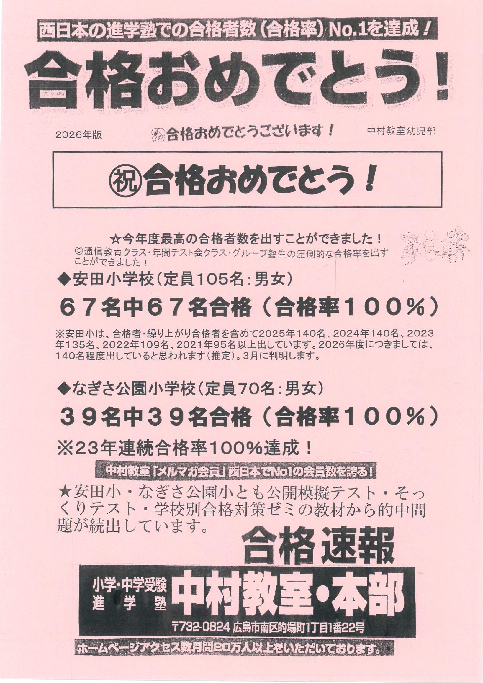 中村教室は全国対応、最高の合格率を今年度も達成。小学・中学受験合格力No1!