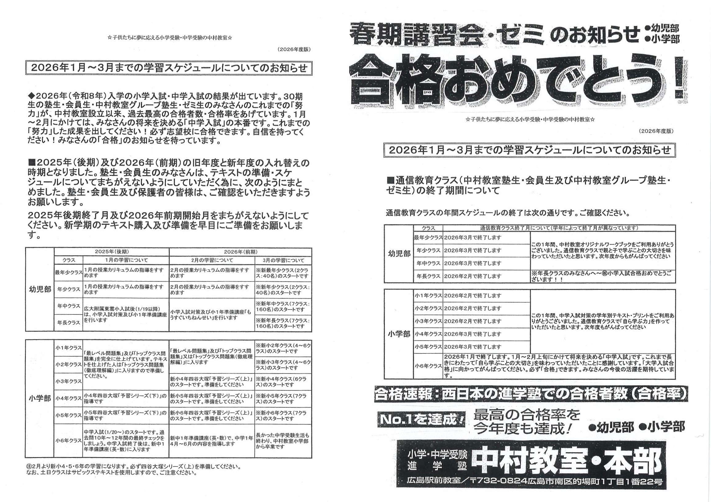 2025年11月28日 ★重要【全クラス生】2026年1月~3月迄の学習スケジュール