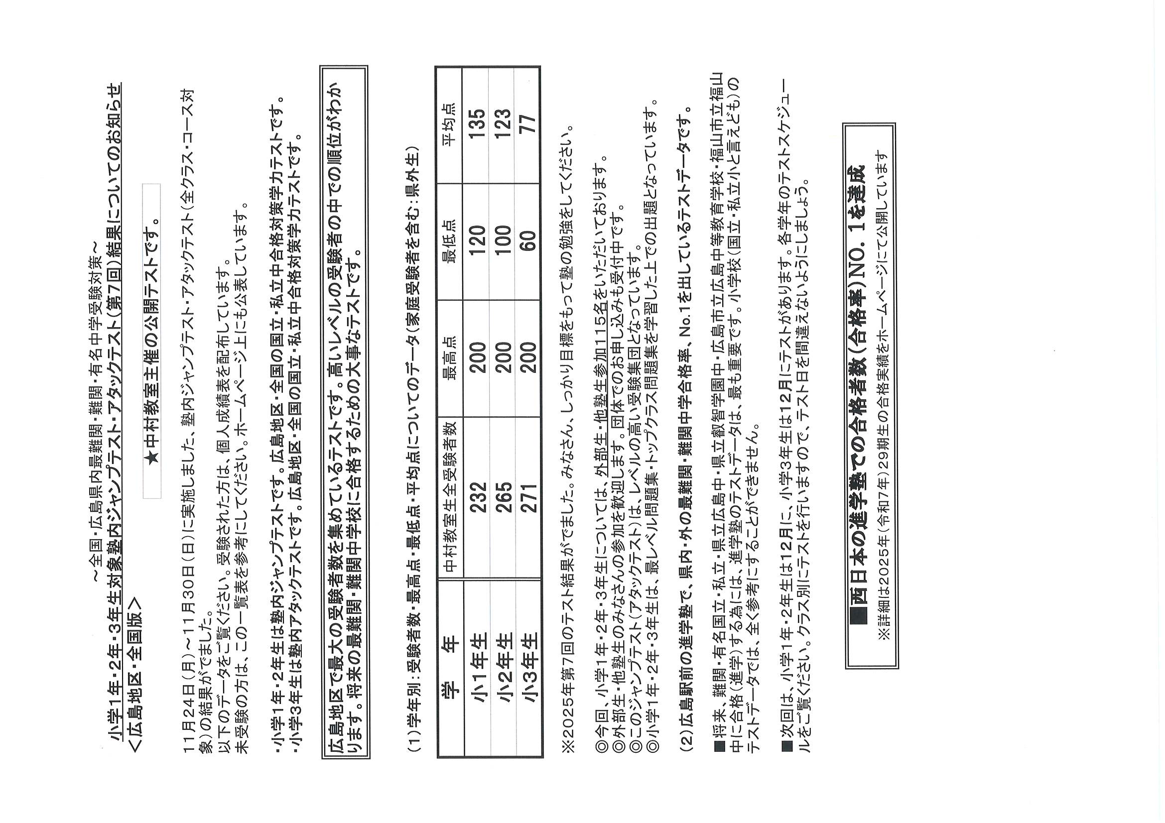 2025年12月01日 中村教室主催 小1・2・3年生 第7回塾内テスト結果