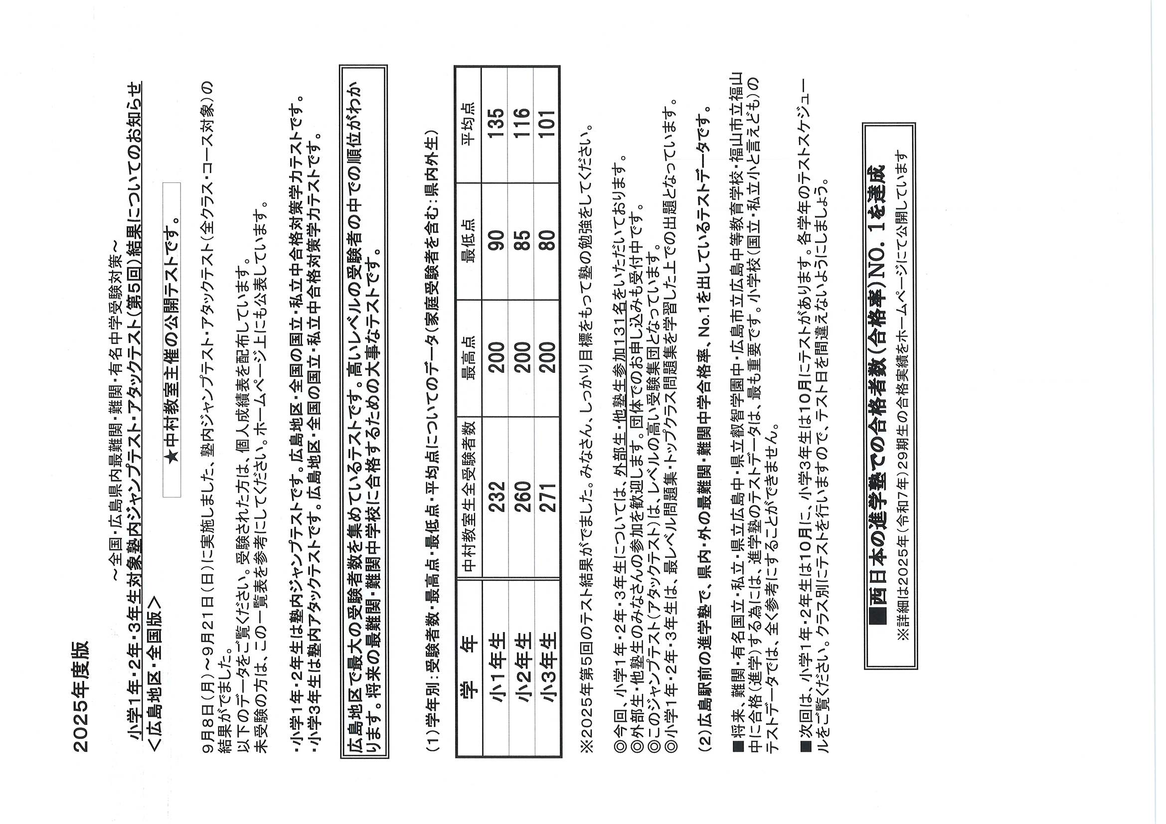 2025年09月22日 中村教室主催 小1・2・3年生 第5回塾内テスト結果