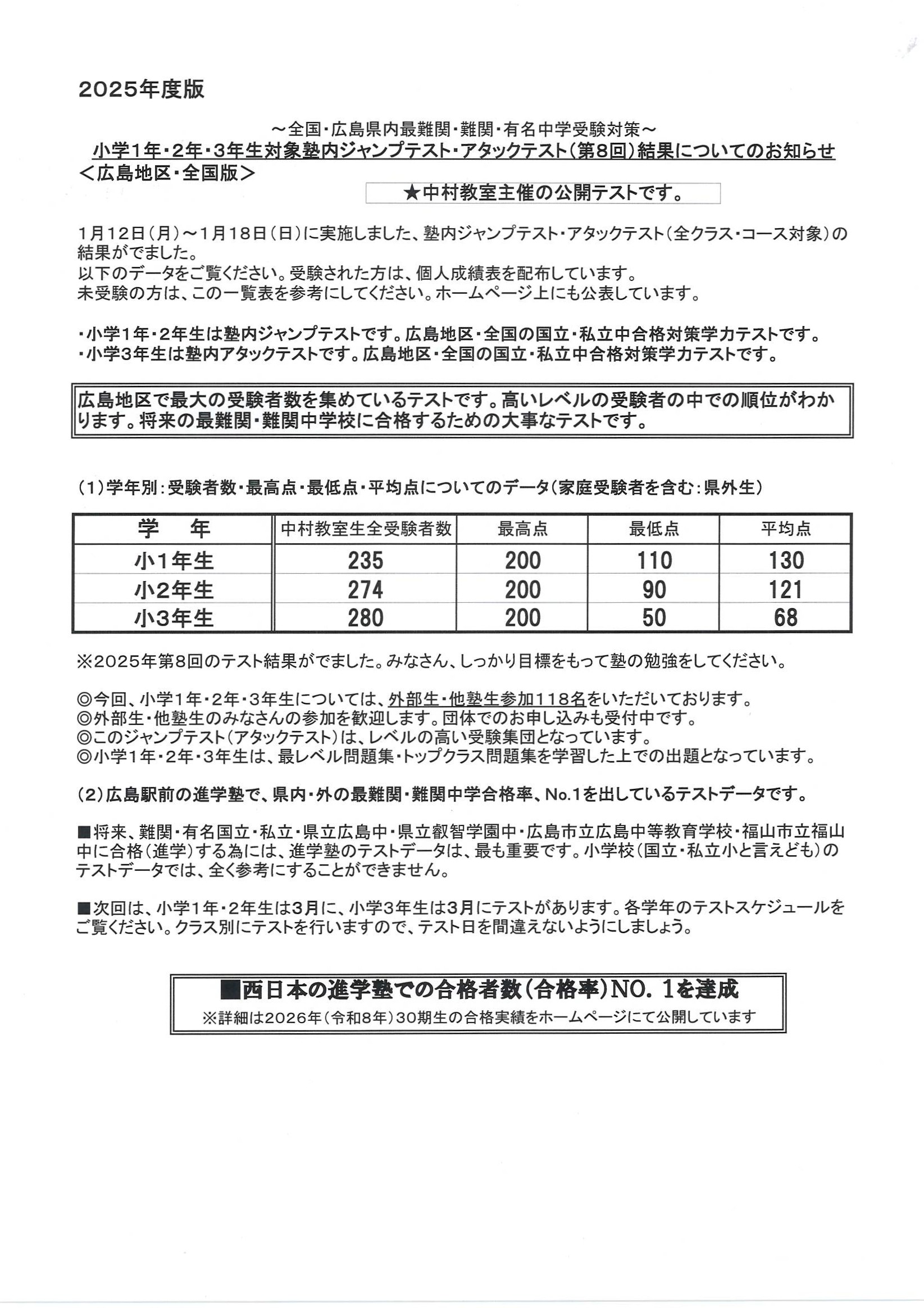 2026年01月19日 中村教室主催 小1・2・3年生 第8回塾内テスト結果