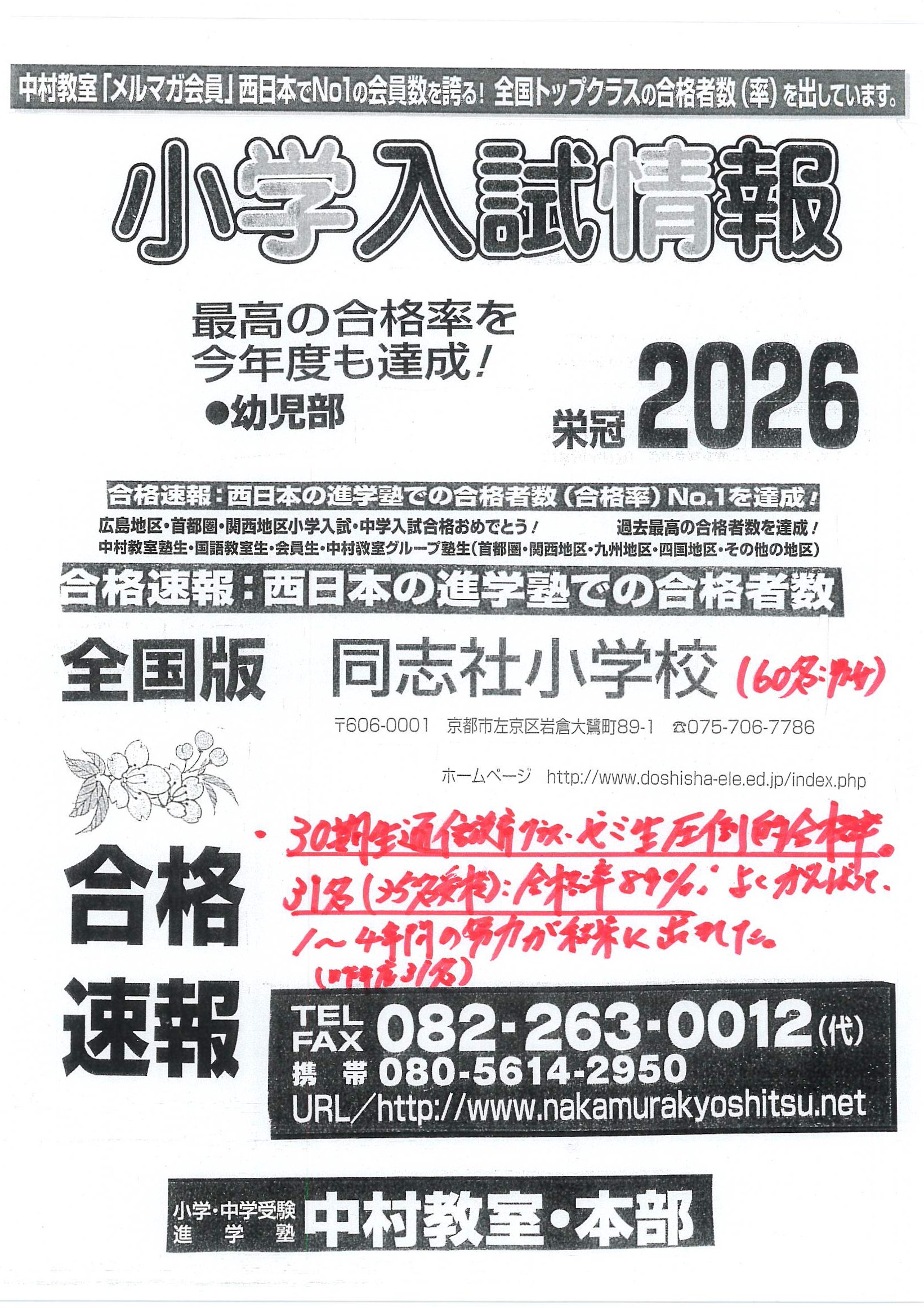 2025年09月01日 ㊗【合格速報】2026年 同志社小 合格おめでとう!