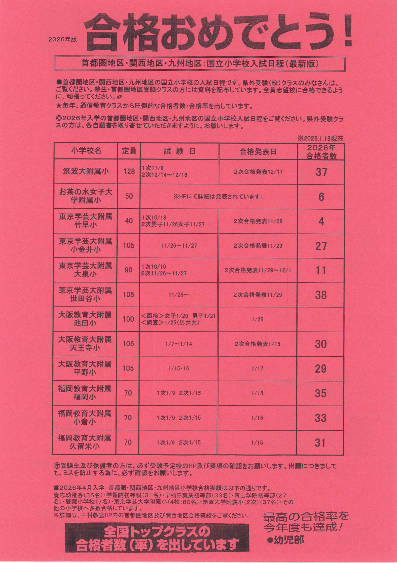 2026年01月18日 ㊗2026年 【首都圏・関西・九州地区】国立小学校合格者数②