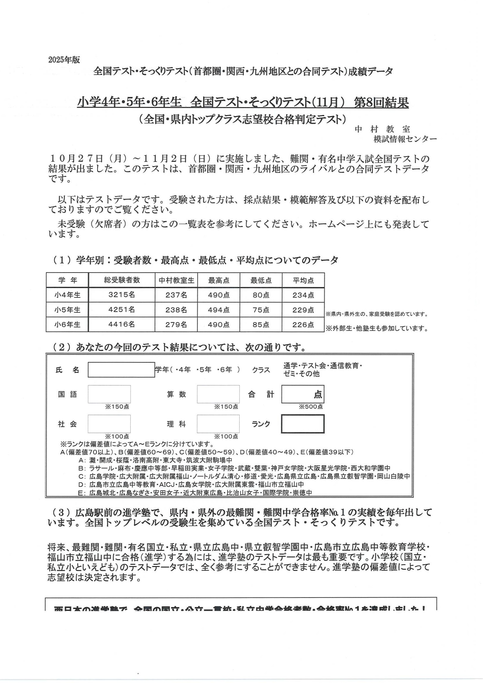 2025年11月03日 【小学部】 第8回全国・そっくりテスト(小4・5・6年)結果
