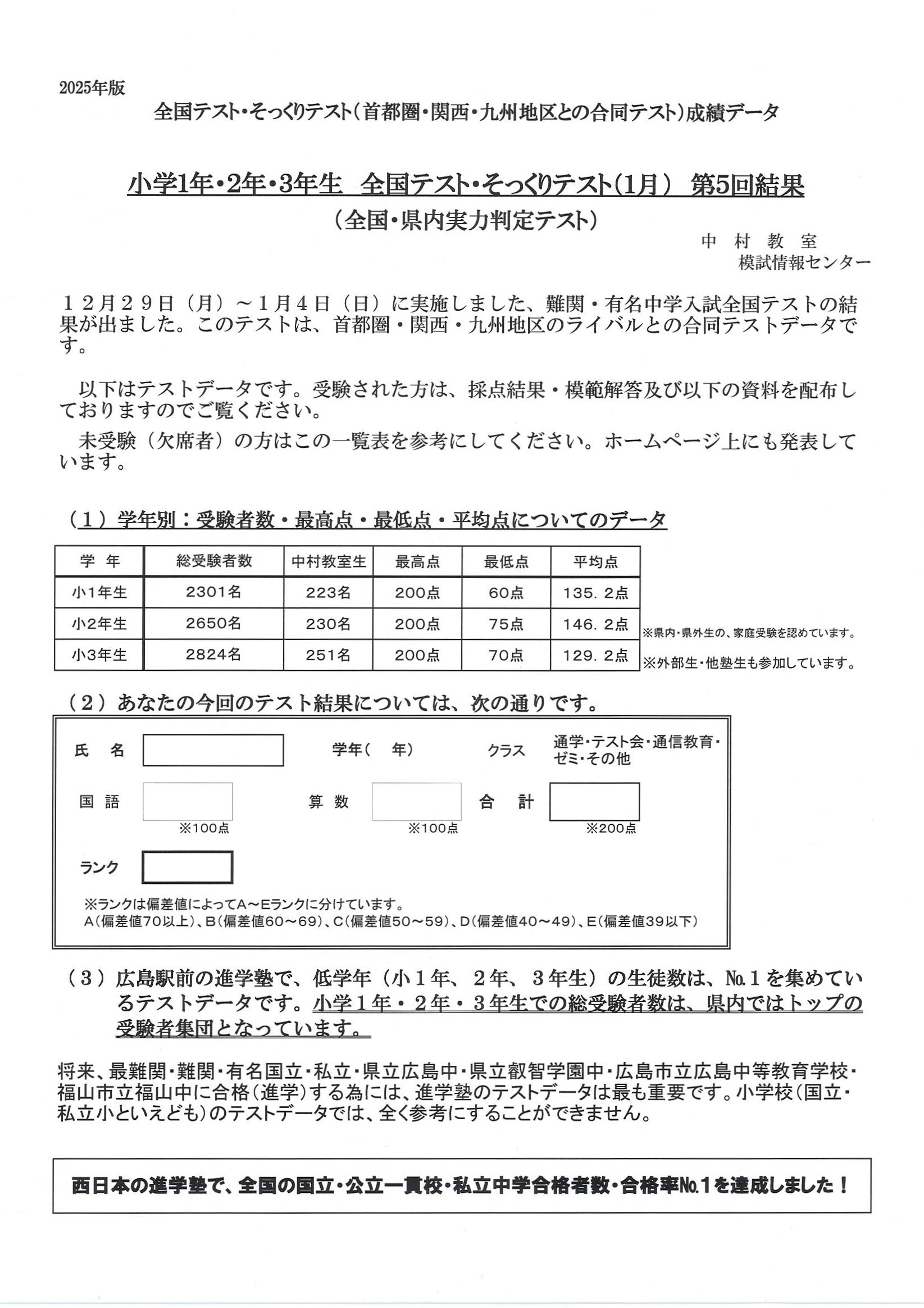2026年01月05日 【小学部】 第5回全国・そっくりテスト(小1・2・3年)結果