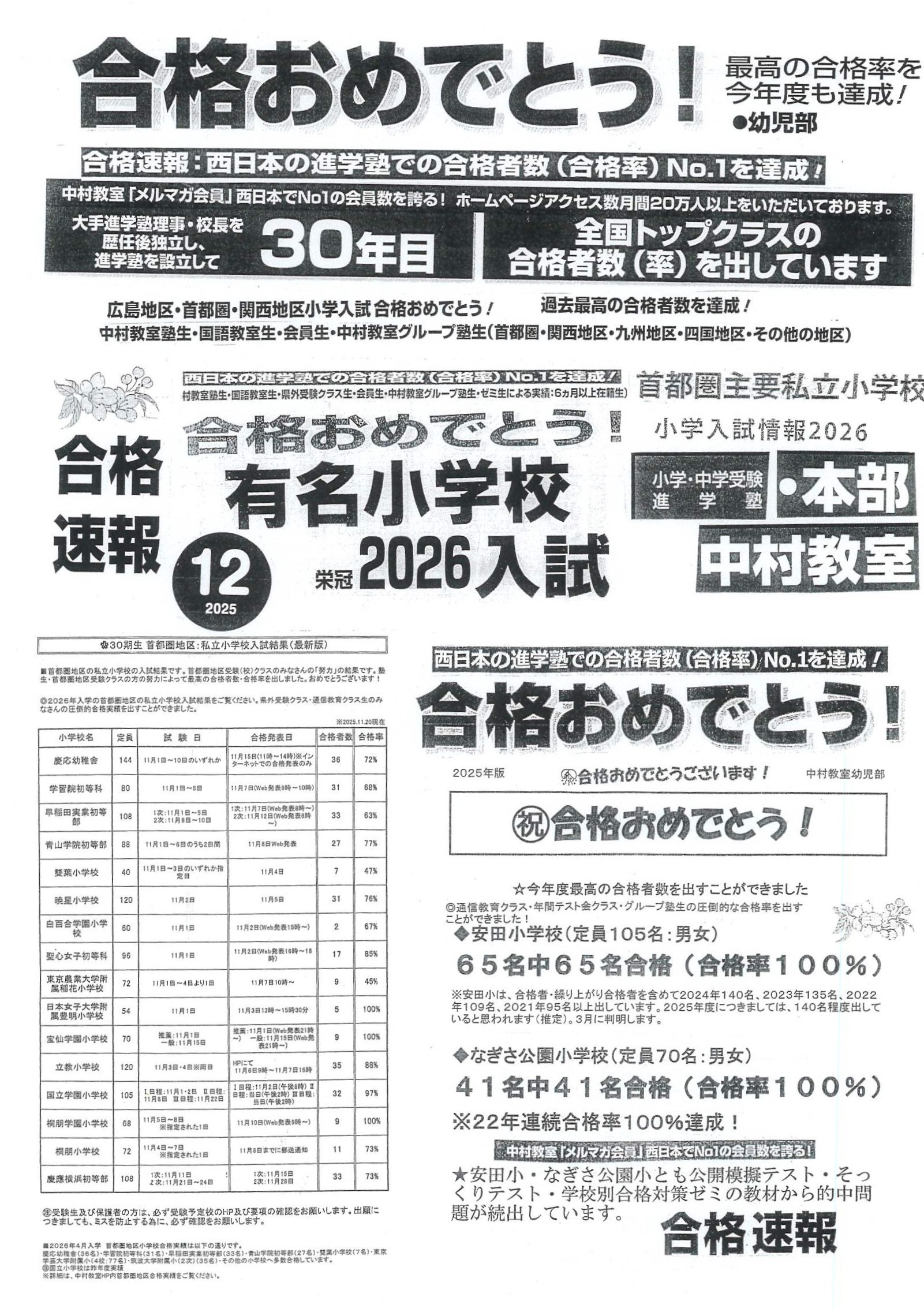 中村教室は全国対応、最高の合格率を今年度も達成。小学・中学受験合格力No1!