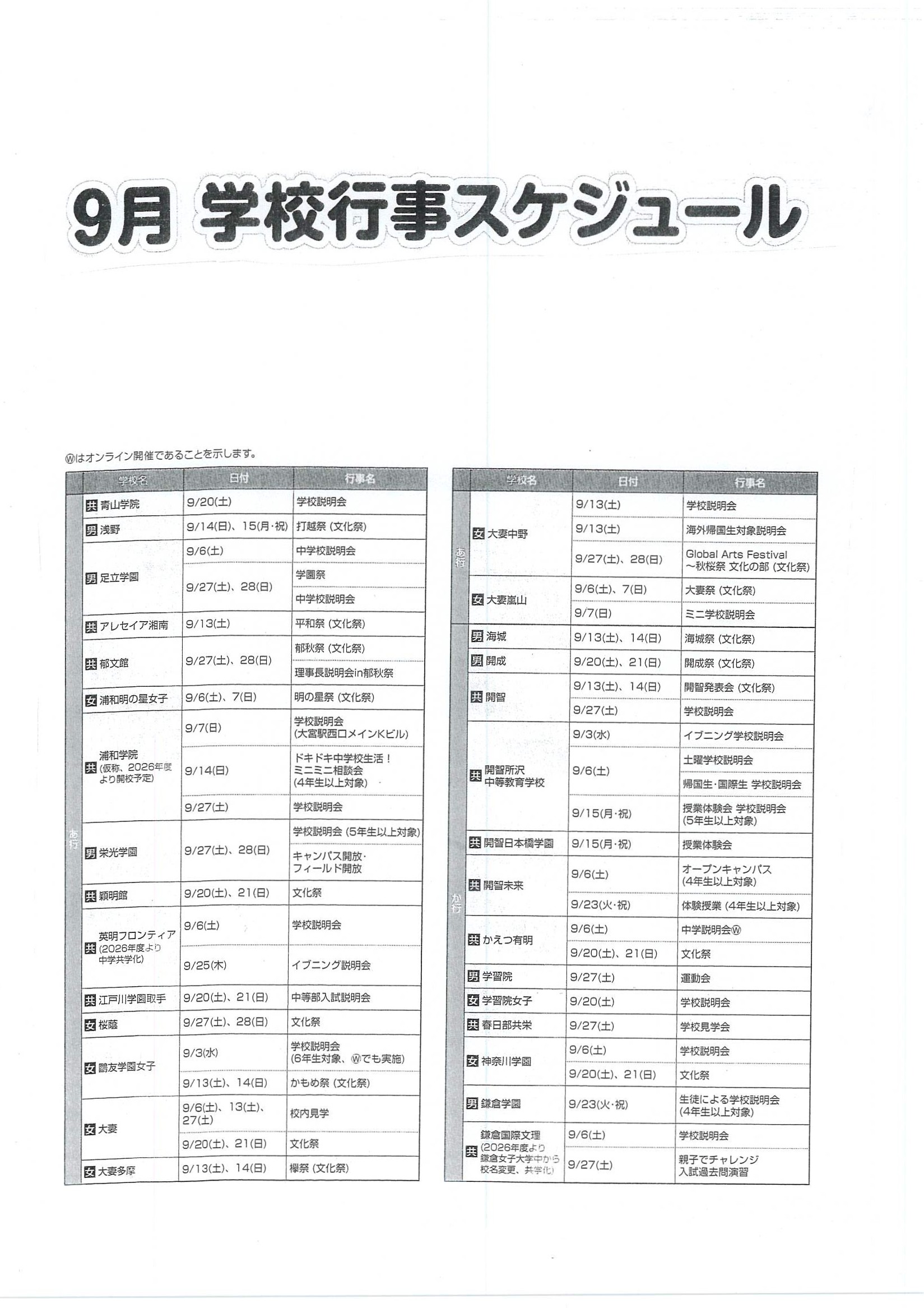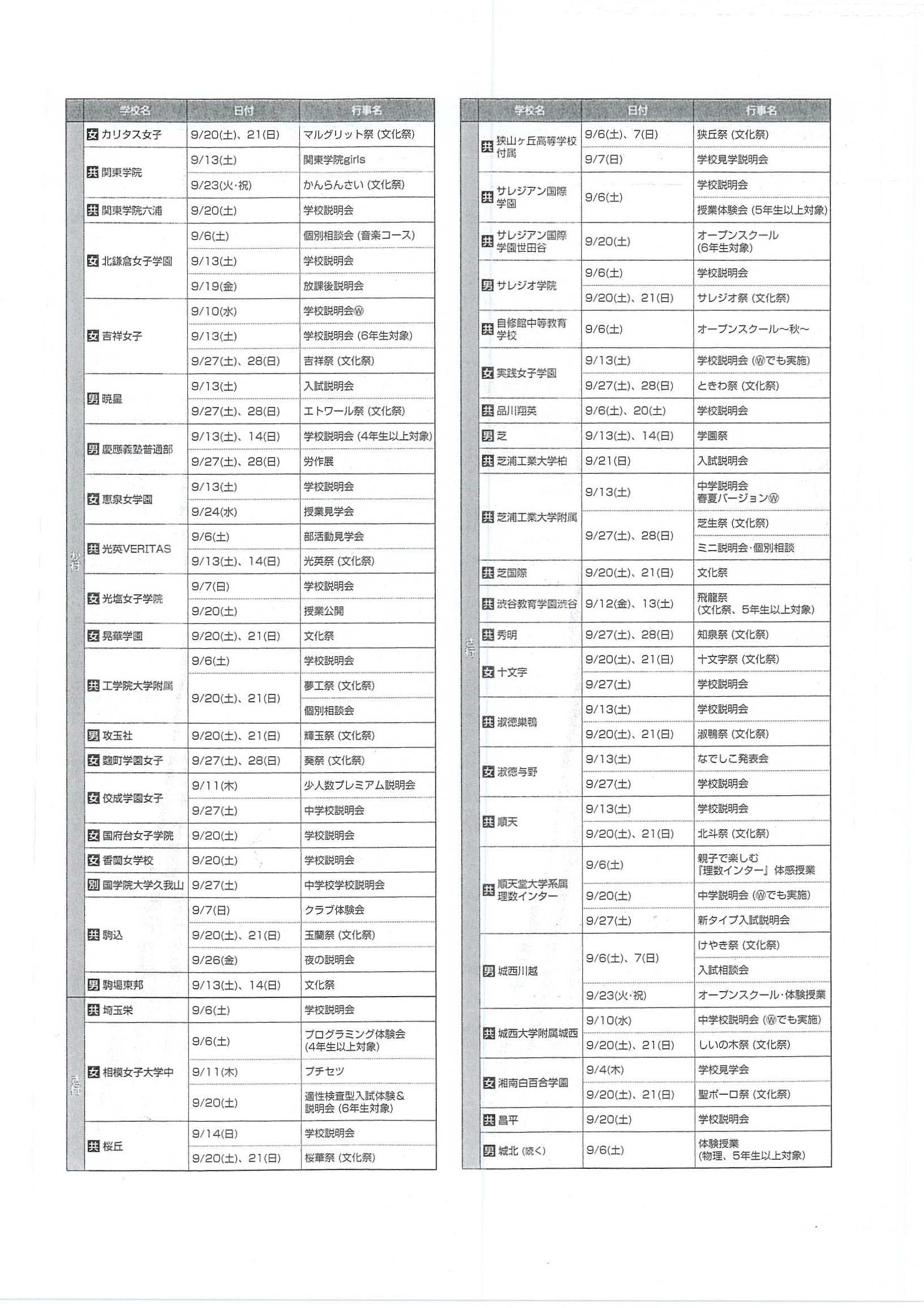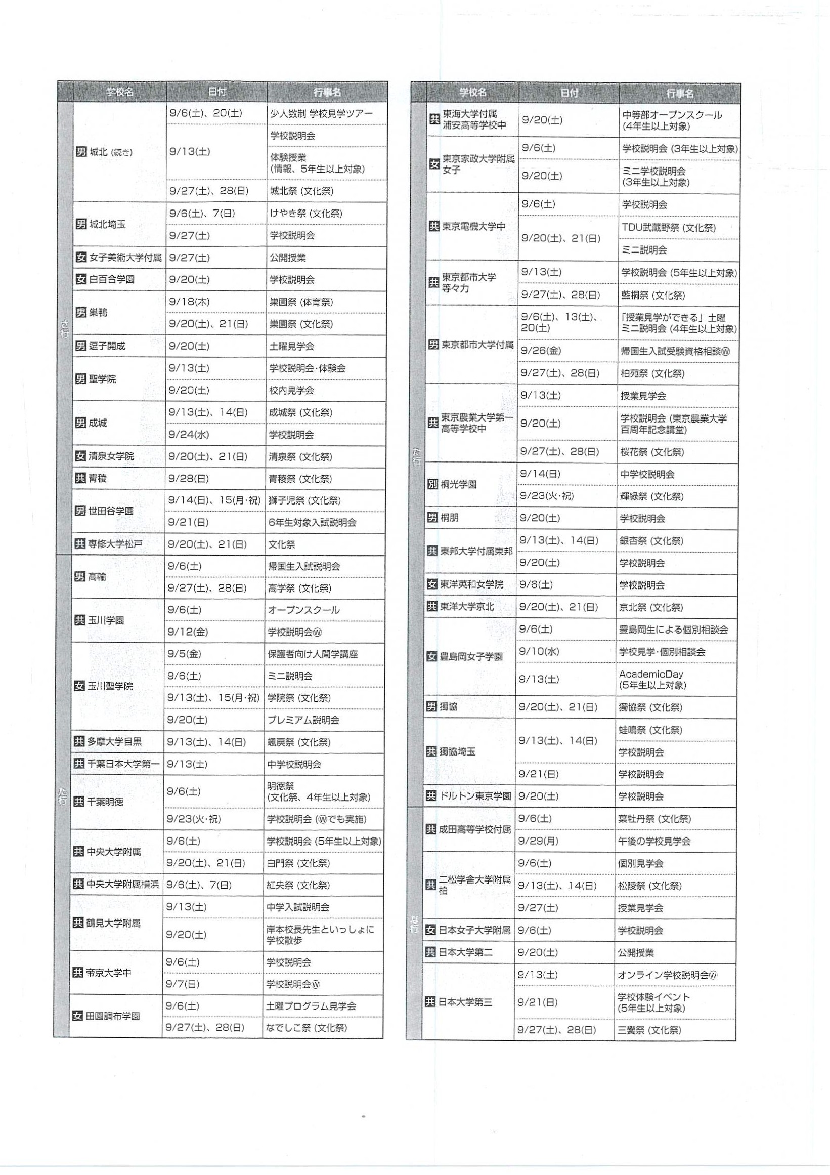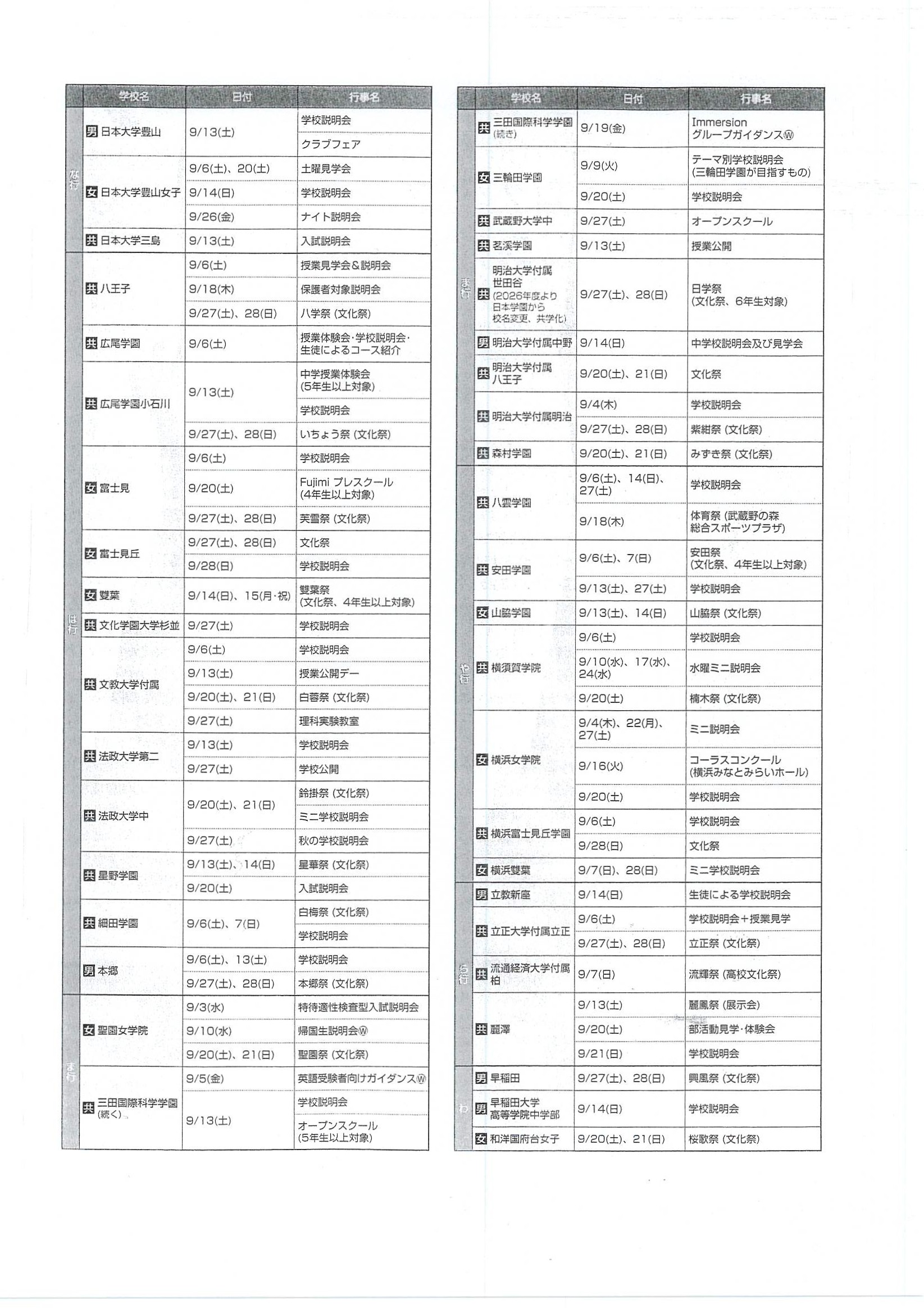 2025年08月24日 2026年 【首都圏中学入試】学校行事スケジュール(9月)
