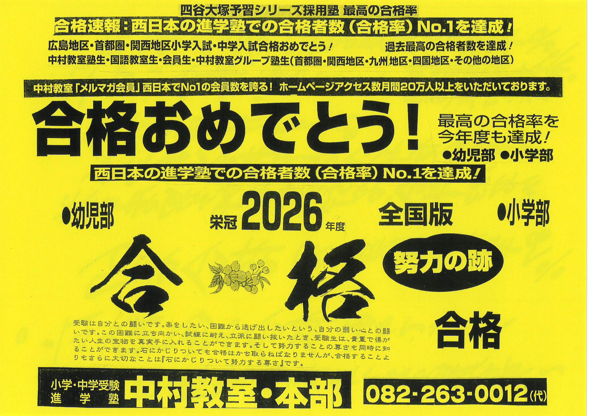 中村教室は全国対応、最高の合格率を今年度も達成。小学・中学受験合格力No1!