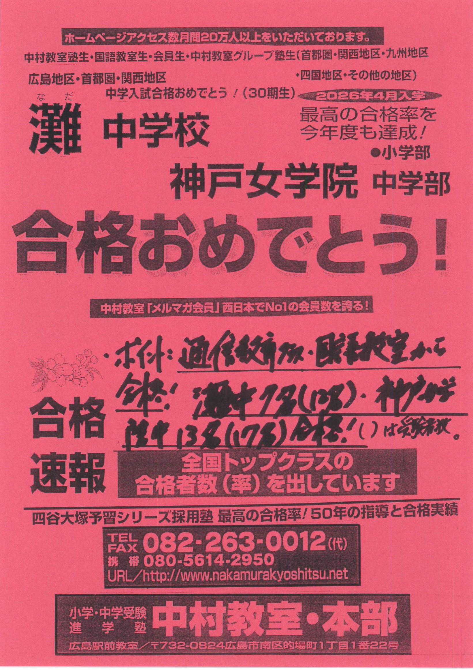 中村教室は全国対応、最高の合格率を今年度も達成。小学・中学受験合格力No1!