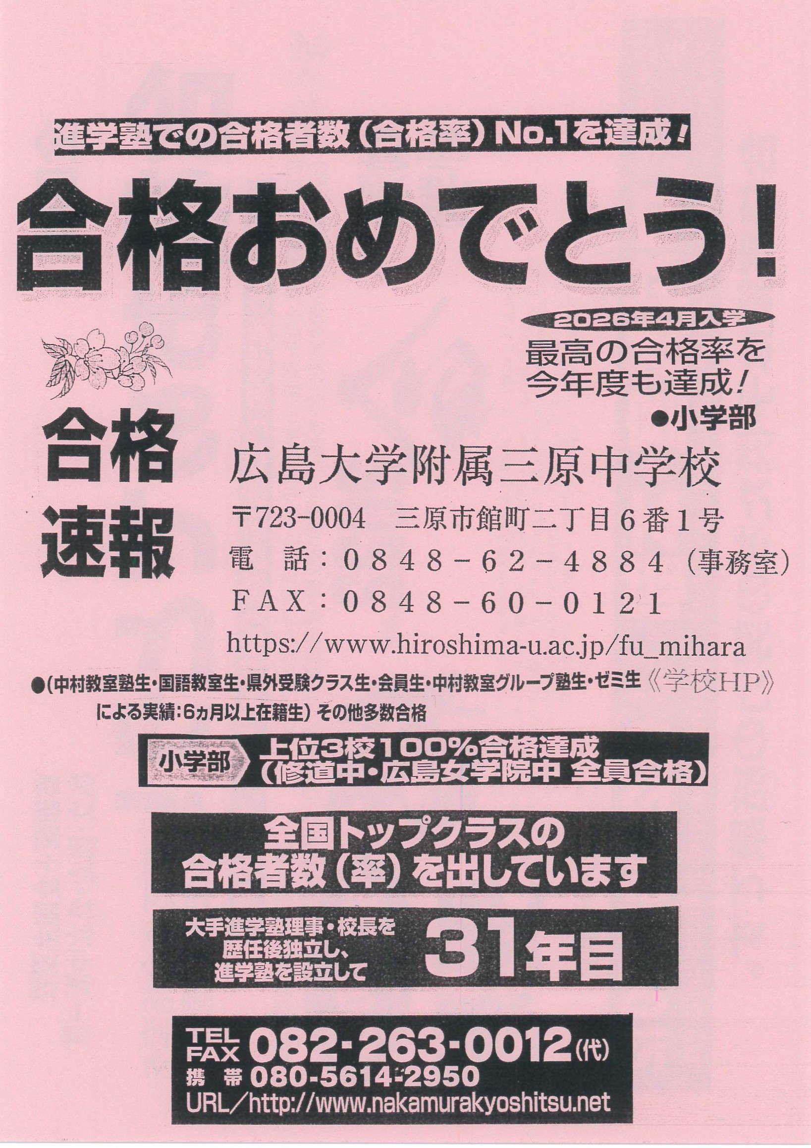 2026年01月26日 ❁㊗広大附属三原中 17名全員合格~おめでとうございます!