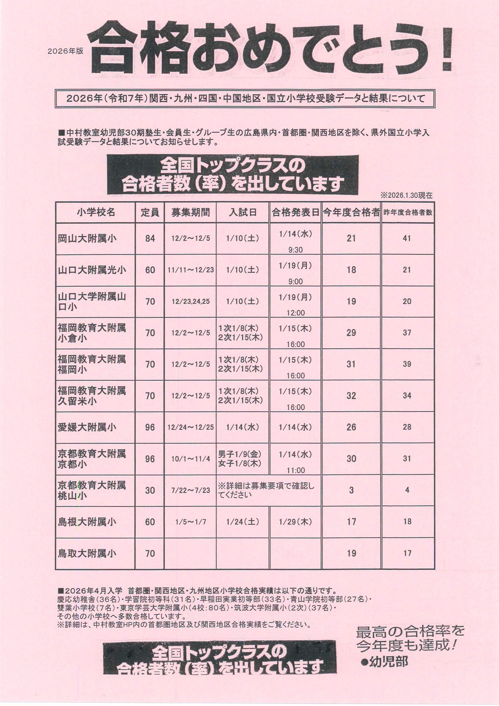 2026年01月30日 ㊗2026年 【関西・九州・四国・中四国地区】国立小学校合格