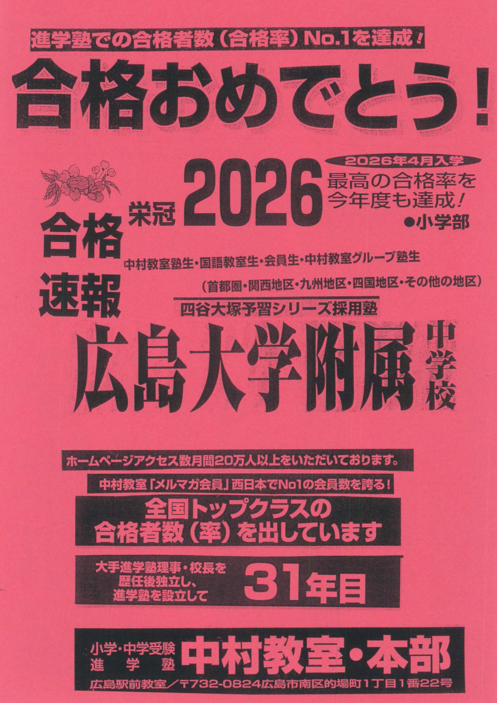 中村教室は全国対応、最高の合格率を今年度も達成。小学・中学受験合格力No1!
