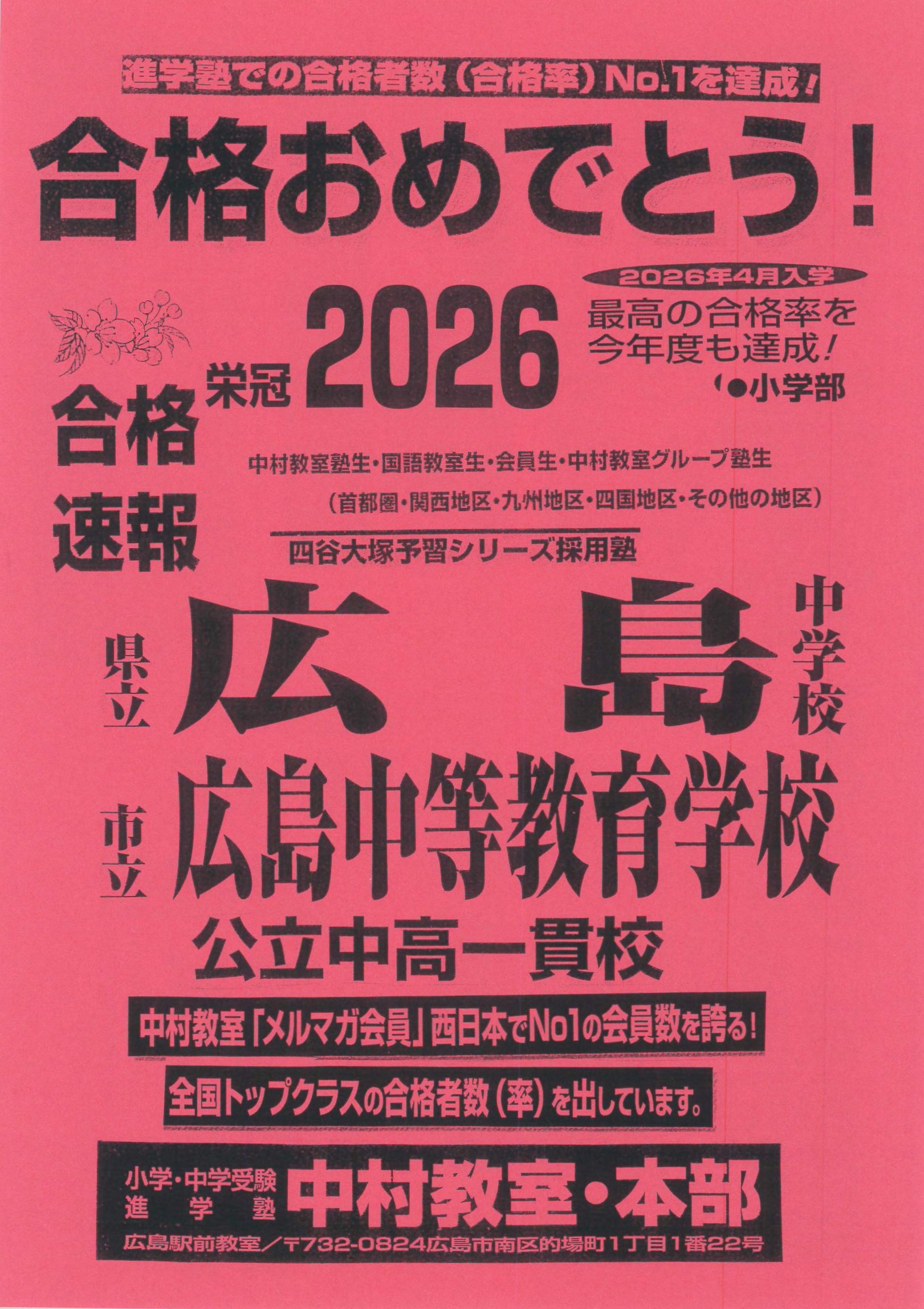 2026年01月31日 ㊗2026年 県立広島中50名・広島中等教育63名 合格!